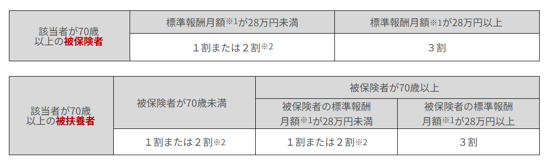 高齢受給者証には、1割から3割のいずれかの一部負担金の割合が記載されていると記述いたしましたが、その割合は下記のとおりです