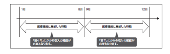 上記フローチャートに記載されている該当期間とは、基準収入額適用申請の際の、収入確認を行う対象期間のことです。詳しくは下記のとおりです。