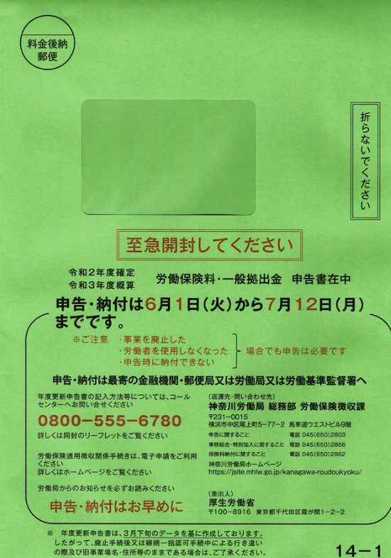 労働保険の年度更新 ~緑色の封筒が届きます~