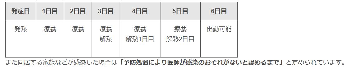 多くの会社では学校保健安全法の基準を取り入れ、出勤停止期間を定めています。