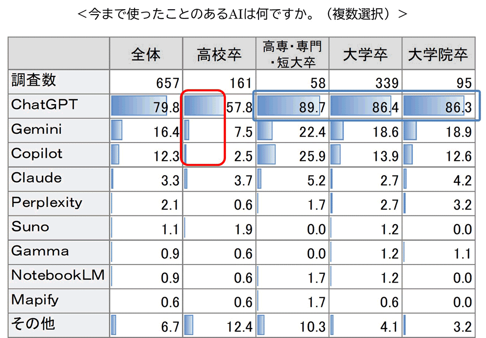 その結果、「AIの利用経験や仕事での利用意欲には学歴間で差があることが判明した。」と発表しました。