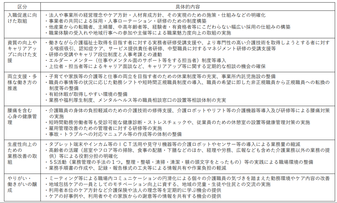 ・ 介護職員の資質向上の目標や以下のいずれかに関する具体的な計画を策定し、当該計画に係る研修の実施又は研修の機会を確保する。