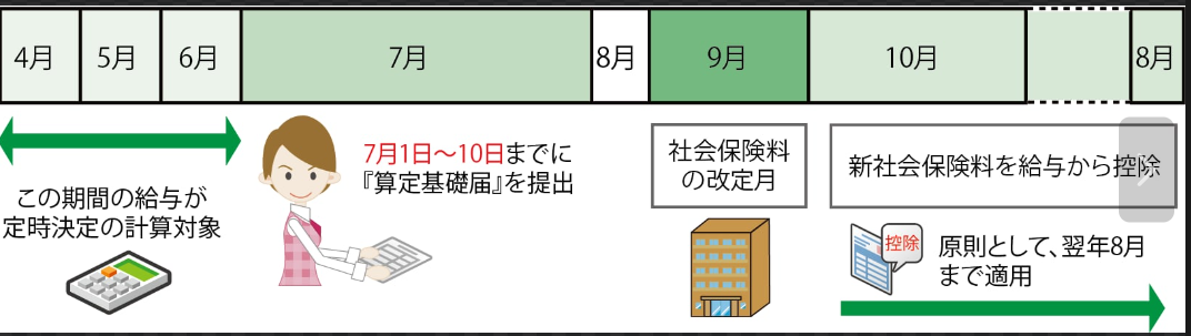 定時決定は4~6月に支給された給与を基に決められ、9月分から翌8月分まで使用されます。
