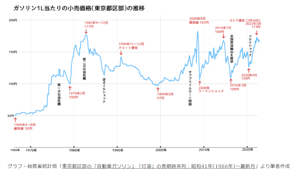 一時期ハイオクガソリンが200円近くになったことは記憶にありましたが、具体的にレギュラーでいくらだったと言われると覚えていませんでした。
