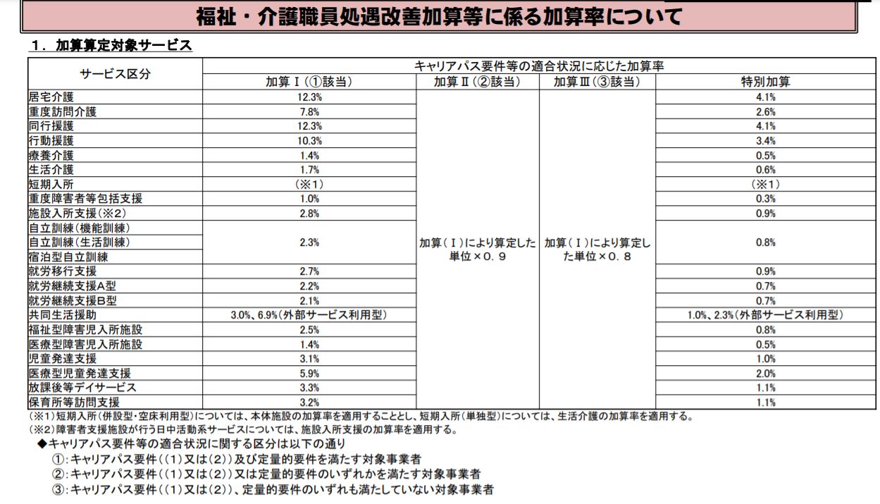 処遇改善加算の加算率は、障害福祉サービスによって異なっており、下記の表のとおりとなっております。
