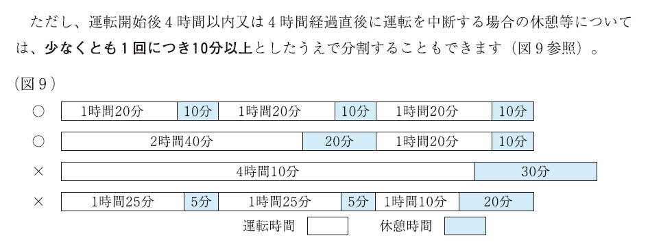 運転開始後4時間以内又は4時間経過直後に運転を中断して30分以上の休憩等を確保しなければなりません。(図8参照)。